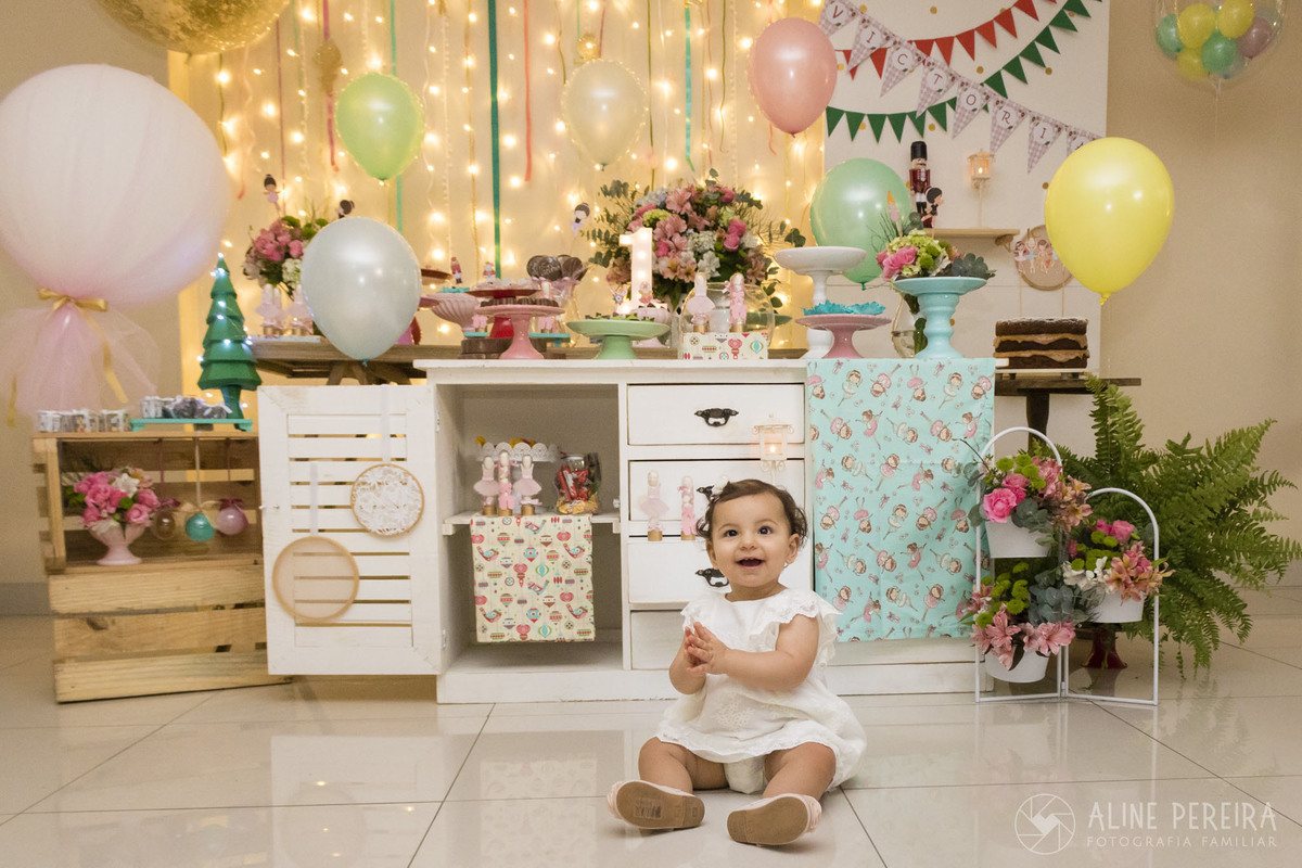 Cobertura fotográfica da festa de aniversário de 1 ano da Vic com o tema quebra nozes no play do seu prédio.